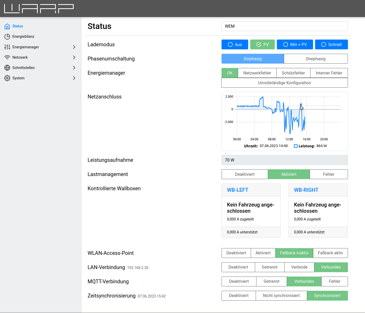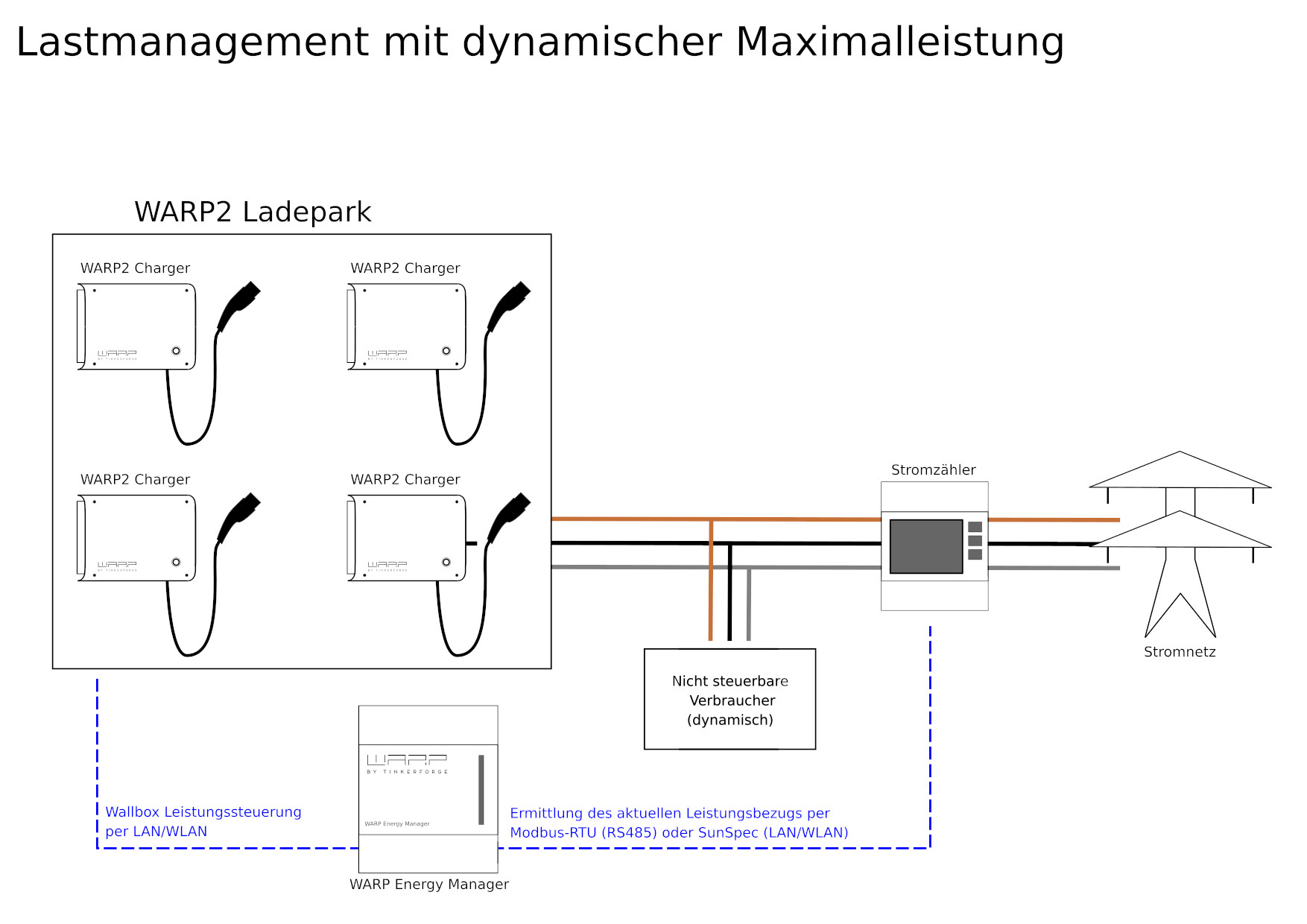 Zukünftig wird ein dynamisches Lastmanagement mit dem WARP Energy Manager möglich sein. Dazu wird mit einem Stromzähler am Hausanschluss der noch zur Verfügung stehende Strom laufend ermittelt und die aktiven Ladevorgänge von WARP Chargern entsprechend geregelt. Es wird sichergestellt, dass der maximale Strom des Hausanschlusses nicht überschritten wird. Dieses Feature wird mittels Softwareupdate ausgerollt.