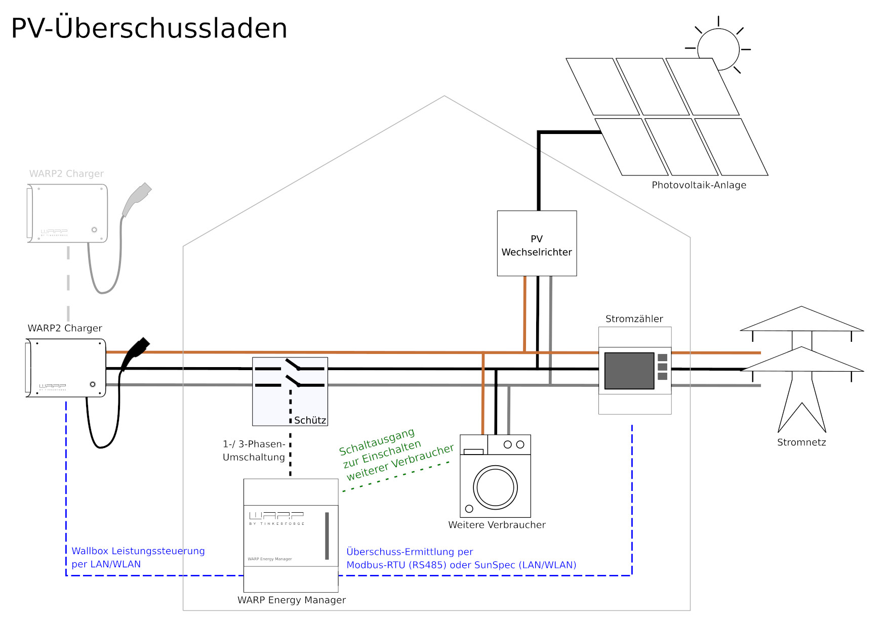 Mit dem WARP Energy Manager in Verbindung mit WARP Chargern kann ein Photovoltaik-Überschussladen realisiert werden. Der eingespeiste Überschuss am Hausanschluss kann zum einen mit einem externen Modbus Stromzähler, der direkt an dem WARP Energy Manager angeschlossen wird, ermittelt werden. Somit können auch Wandler-Stromzähler genutzt werden. Viele PV-Anlagen stellen die notwendigen Messwerte aber auch über eine SunSpec Schnittstelle (Modbus TCP) zur Verfügung. In diesem Fall ist kein zusätzlicher Stromzähler notwendig. Der WARP Energy Manager kann direkt auf die Messwerte mittels SunSpec zugreifen.
