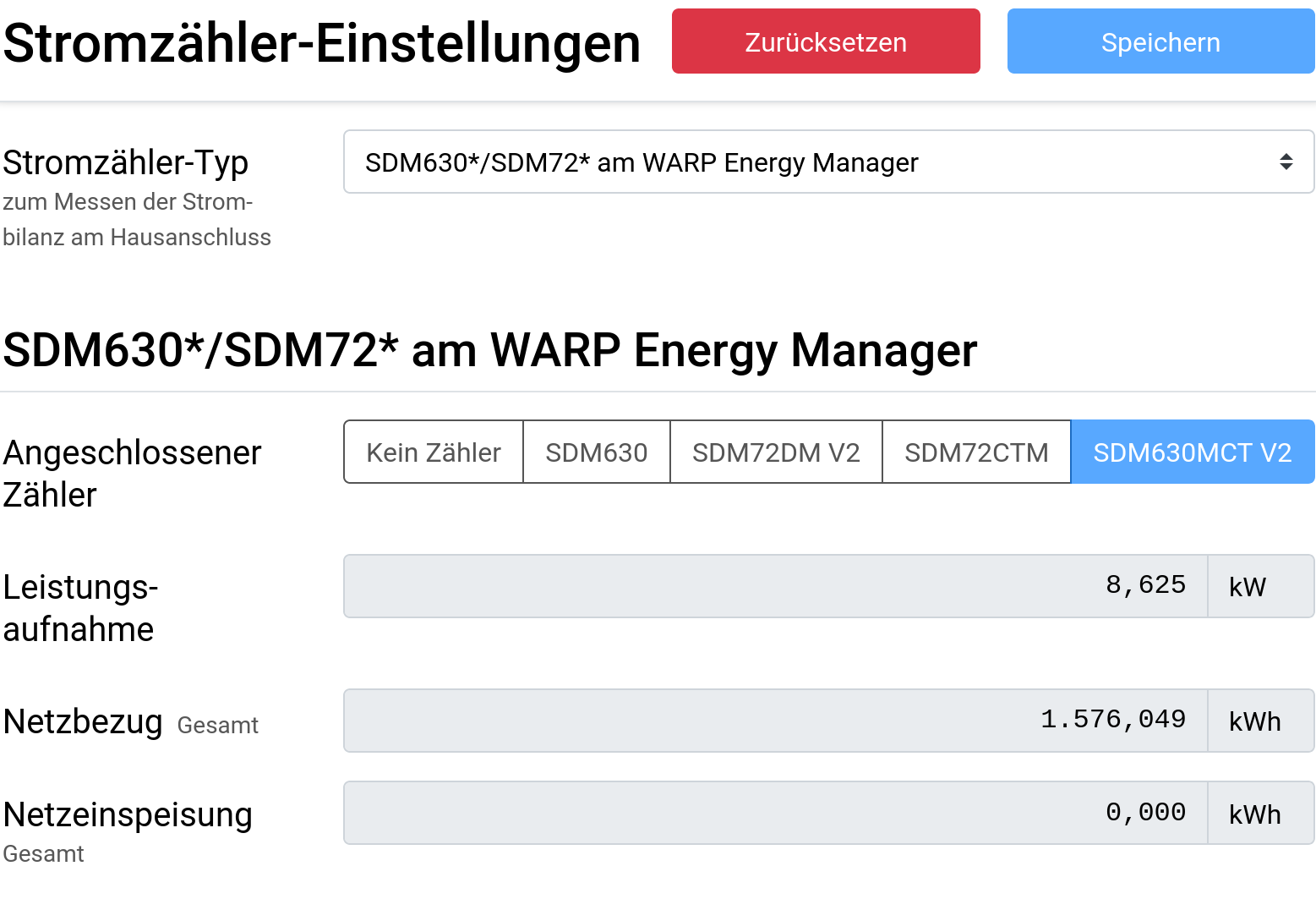 Der WARP Energy Manager kann bis zu sieben verschiedene Stromzähler verwalten. Es werden vier verschiedene Arten von Stromzählern unterstützt: