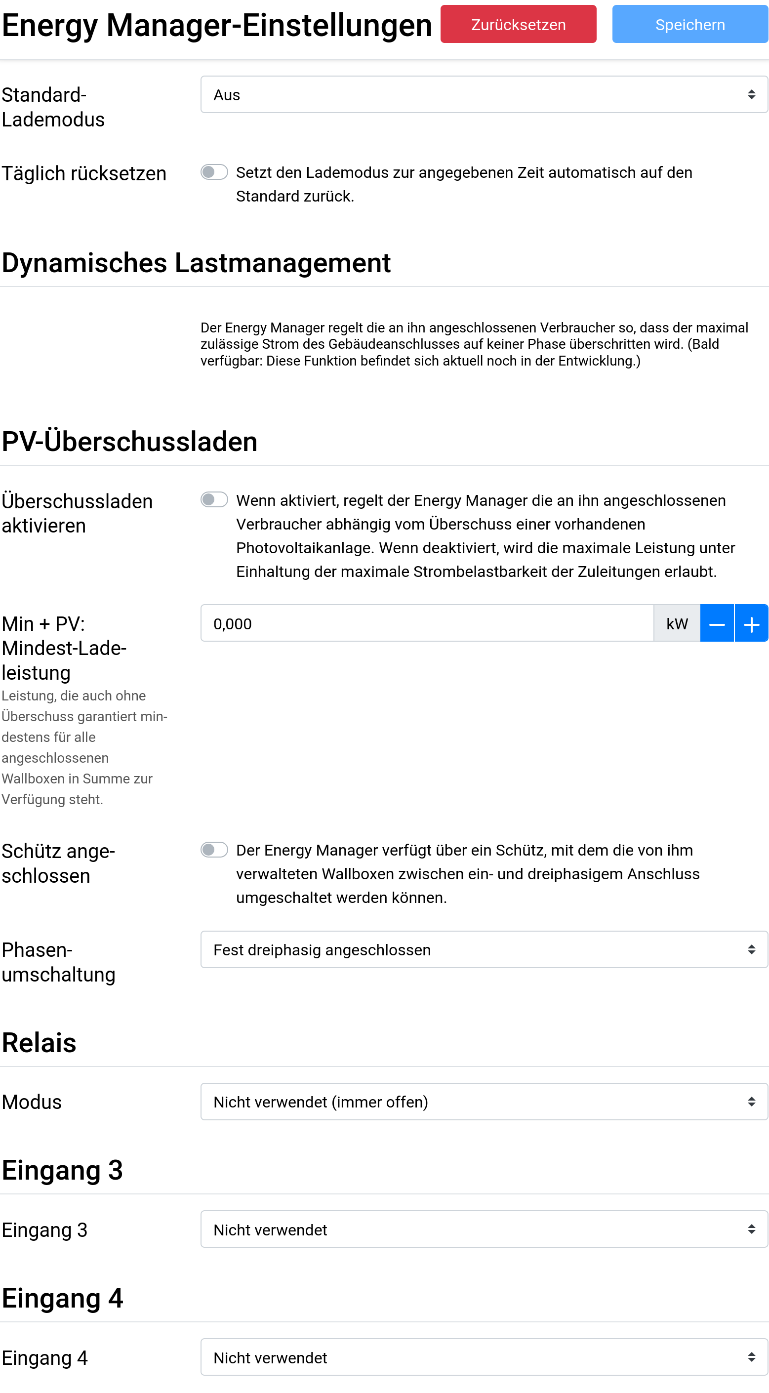 Ein individuelles Energiemanagement ist mit konfigurierbare Automatisierungsregeln möglich. So können zum Beispiel die zwei Eingänge des WARP Energy Managers genutzt werden um die Ladeleistung abhängig von einem Rundsteuerempfänger zu reduzieren. SG-Ready fähige Wärmepumpen können hingegen mit dem Relais-Ausgang gesteuert werden.
